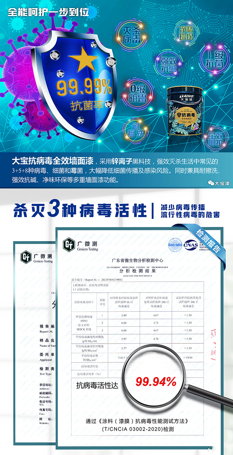 因應(yīng)日趨嚴(yán)峻的疫情,大寶抗病毒全效墻面漆的誕生猶如一場(chǎng)及時(shí)雨,給予我們實(shí)質(zhì)上的安全感,全方位締造健康安全的居室空間。
