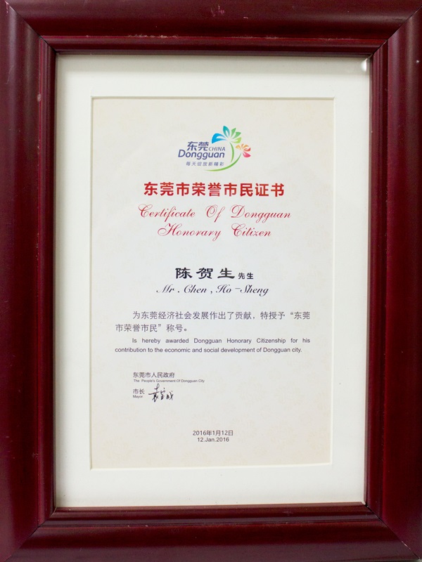 2016年1月12日,第五屆“東莞市榮譽(yù)市民”授榮儀式在會(huì)展國(guó)際大酒店隆重舉行,東莞大寶化工制品有限公司董事長(zhǎng)陳賀生等45人獲“東莞市榮譽(yù)市民”稱號(hào)。