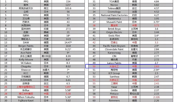 近日,美國《涂料世界》(Coatings World)雜志發(fā)布了2019年全球頂級(jí)涂料制造企業(yè)排行榜。本次上榜共82家公司,入圍門檻為2018年銷售額超過1億美元。榜單是基于涂料業(yè)務(wù)年銷售額(以美元計(jì))排名。知名涂料品牌大寶漆,此次再次上榜,位列第50名。這已經(jīng)是大寶漆連續(xù)多年登上該排行榜。