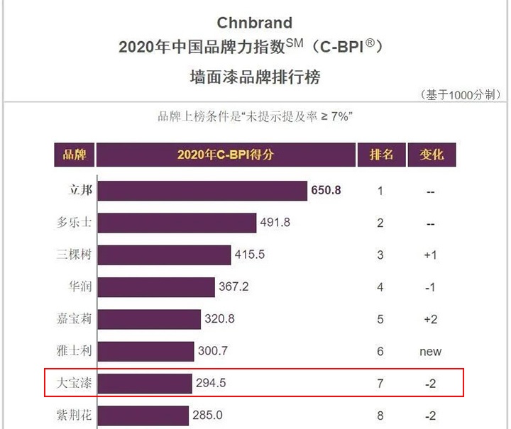4月22日,中國領(lǐng)先的品牌評級權(quán)威機(jī)構(gòu)Chnbrand通過官網(wǎng)發(fā)布了2020年(第十屆)中國品牌力指數(shù)(C-BPI)品牌排名和分析報告。在激烈的品牌力競爭中,大寶漆脫穎而出,再一次登上墻面漆、木器漆兩大品牌力指數(shù)排行榜單。