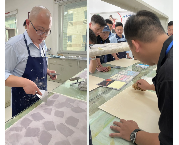 藝術(shù)涂料培訓(xùn)采用理論與實踐相結(jié)合,秉承“學(xué)完即會”的宗旨,使參訓(xùn)人員學(xué)會藝術(shù)涂料施工技能,掌握藝術(shù)涂料產(chǎn)品銷售技巧。培訓(xùn)采用教練技術(shù)進行,即第一步:講給學(xué)員聽,第二步:做給學(xué)員看,第三步:學(xué)員做給老師看,第四步:進行指導(dǎo)和糾正。通過學(xué)習(xí)后,學(xué)員學(xué)會制作3D銀箔、絲綢幻彩、三色珠光、米蘭絲絨、天然彩陶砂、無機灰泥、貝殼絲絨、雅晶石、天鵝絨和2021年的新效果:清水混凝土等工藝效果。