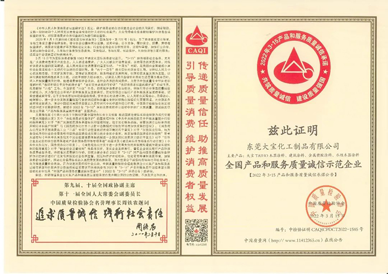 榮譽(yù),是對(duì)大寶漆的肯定,更是推動(dòng)大寶漆不斷向前發(fā)展的動(dòng)力!未來(lái),大寶漆仍將不忘初心,始終專(zhuān)注于高品質(zhì)涂料的研發(fā)推廣,積極恪守質(zhì)量誠(chéng)信,踐行社會(huì)責(zé)任,以微薄之力助推國(guó)家“質(zhì)量強(qiáng)國(guó)”建設(shè)。