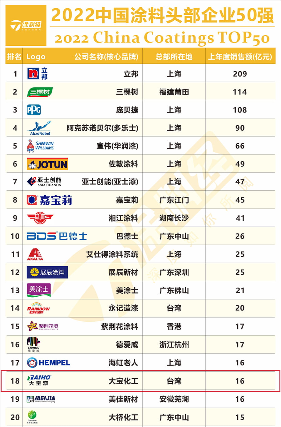 “2022中國(guó)民族涂料50強(qiáng)”榜單排名依據(jù)上一年度銷(xiāo)售額, “民族涂料”,是指發(fā)源地為中國(guó)(包括港澳臺(tái))、不涉及外資(港澳臺(tái)資本除外)的涂料企業(yè),且只選取其上一年在中國(guó)市場(chǎng)(包括港澳臺(tái))的銷(xiāo)售數(shù)據(jù)作為排行依據(jù)。