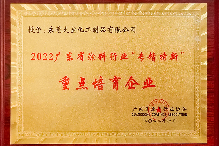 東莞大寶化工制品有限公司獲得2022年廣東省涂料行業(yè)協(xié)會(huì)“專(zhuān)精特新”重點(diǎn)培育企業(yè)獎(jiǎng)。