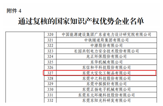 獲此殊榮的企業(yè),須能夠承接國家重大、重點產業(yè)發(fā)展項目,具備自主知識產權能力,通過積極開展知識產權保護和運用,建立全面的知識產權管理制度和機制,具有知識產權綜合實力。東莞大寶化工制品有限公司于2019年被認定為“國家知識產權優(yōu)勢企業(yè)”,本次順利通過復核,意味著大寶漆自身的科研實力、知識產權建設示范工作再次得到了政府和社會的高度認可。