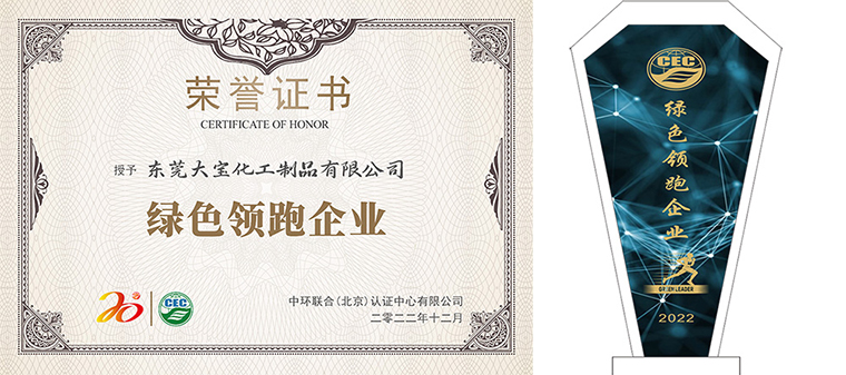東莞大寶化工制品有限公司榮獲由中環(huán)聯(lián)合認(rèn)證中心授予的“綠色領(lǐng)跑企業(yè)”榮譽(yù)稱號(hào),這是對東莞大寶化工30年來不斷在綠色環(huán)保方面追求卓越的最好嘉許。
