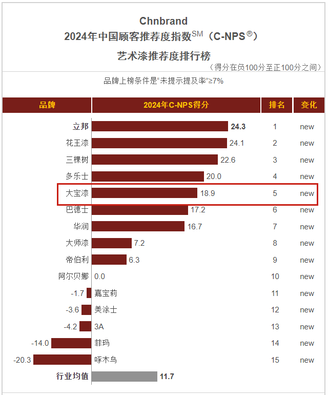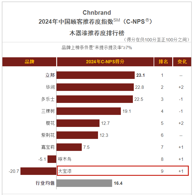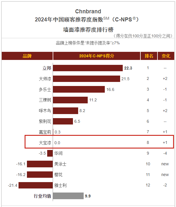 1月,品牌評級權威機構Chnbrand發(fā)布2024年(第十屆)中國顧客推薦度指數(C-NPS)品牌排名和分析報告。大寶墻面漆、木器漆、藝術漆分別以優(yōu)異的口碑入圍排行榜單。