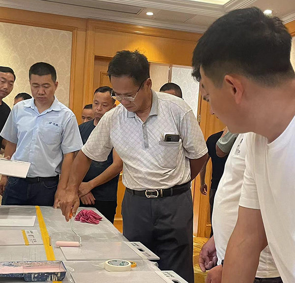 技術(shù)部周微老師為大家?guī)硭囆g(shù)涂料新品工藝的培訓(xùn),大家熱情高漲,積極參與,詳細(xì)記錄了各個工序環(huán)節(jié)的注意事項(xiàng),60塊樣板全部現(xiàn)場制作完成。加強(qiáng)對經(jīng)銷商和施工人員的技術(shù)培訓(xùn),提高其對仿石漆的認(rèn)知和施工技能,確保產(chǎn)品應(yīng)用效果。