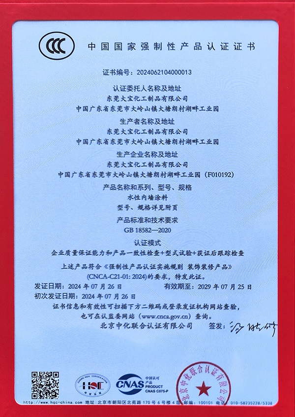 東莞大寶化工率先申請水性內(nèi)墻涂料CCC認證,順利通過嚴格審核與評估,獲得行業(yè)首批水性內(nèi)墻涂料CCC認證證書。