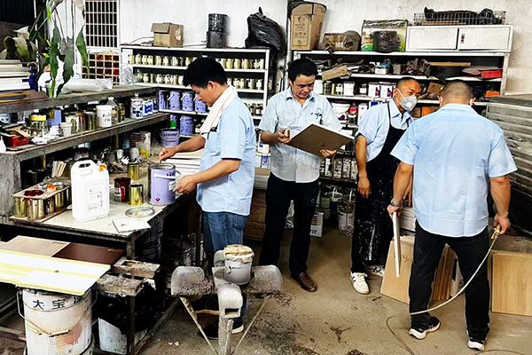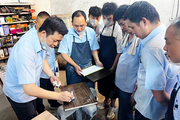 理論課程后,趙副理帶領(lǐng)大家投入色板制作實(shí)戰(zhàn)。從白胚檢查、砂光處理,到底色施工、底漆噴涂、修色及面漆完工,每一個(gè)環(huán)節(jié)都結(jié)合產(chǎn)品特性與配比要求進(jìn)行實(shí)操演練,幫助大家真正掌握完整工藝流程,提升在實(shí)際服務(wù)中的應(yīng)對(duì)能力。