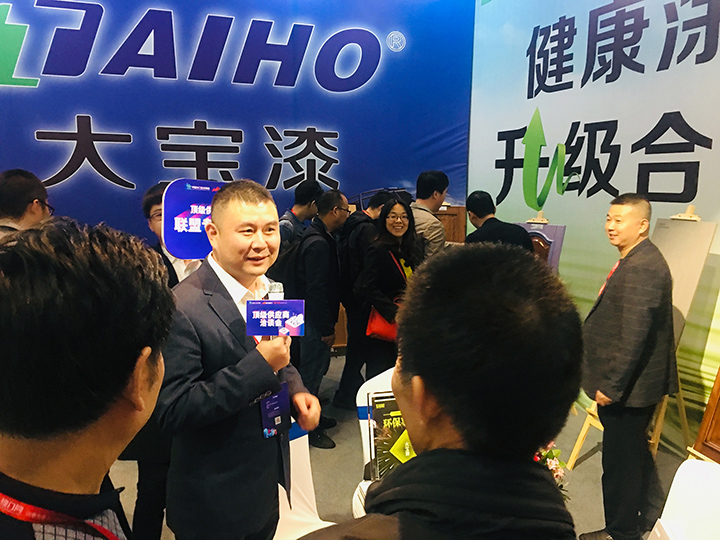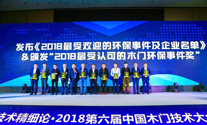 大寶漆榮獲2018最受認(rèn)可的木門環(huán)保事件獎(左四謝偉代表領(lǐng)獎)