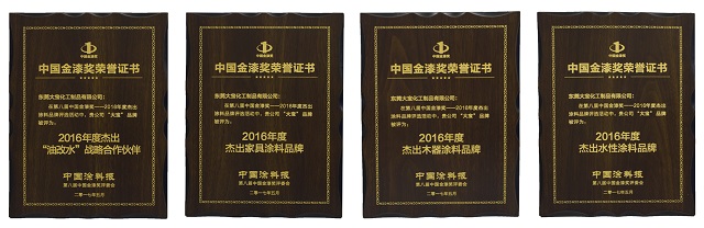 會議頒發(fā)了在多個細分渠道領域的2016年度杰出涂料品牌,大寶漆憑借其臻于至善的品質及消費者的支持,榮膺2016年度杰出“油改水”戰(zhàn)略合作伙伴、杰出木器裝修涂料品牌、杰出家具涂料品牌、杰出水性涂料品牌等4項大獎。同時,大寶漆經銷商杭州啟納實業(yè)有限公司獲得了2016年度杰出家具涂料經銷商獎項。大寶漆獨攬5個獎項,收獲頗豐。